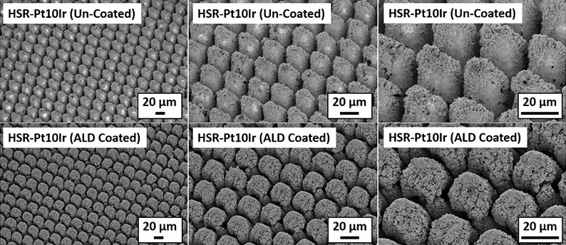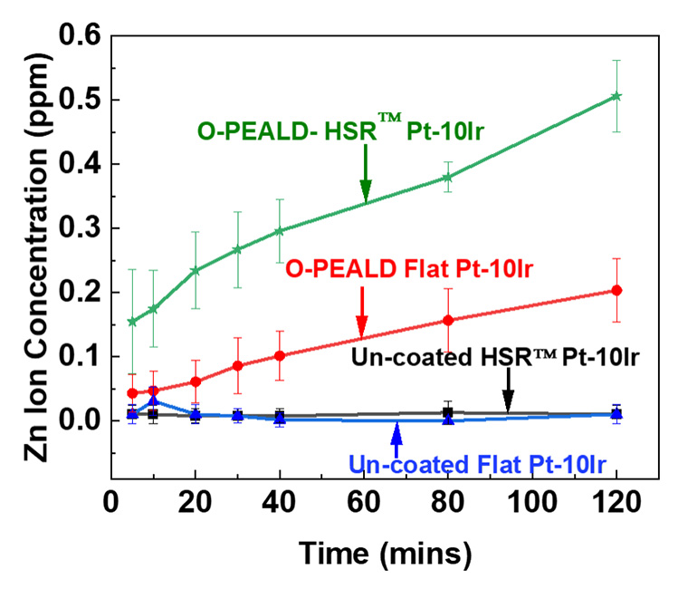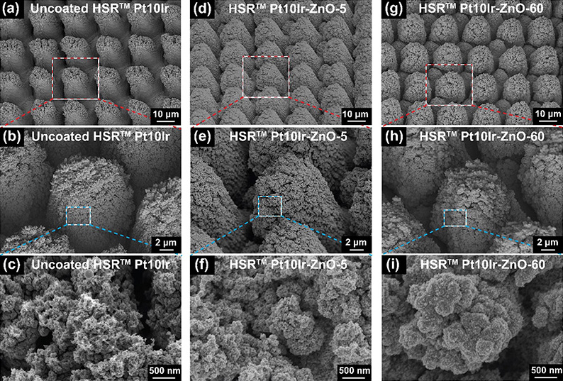 This approach preserves the underlying electrode architecture rather than relying on a single coating to deliver multiple functions. The hierarchical HSR™ surface remains responsible for the enhanced electrochemical performance of the electrode, while the metal oxide layer introduces a second function—antibacterial activity at the electrode–tissue interface.