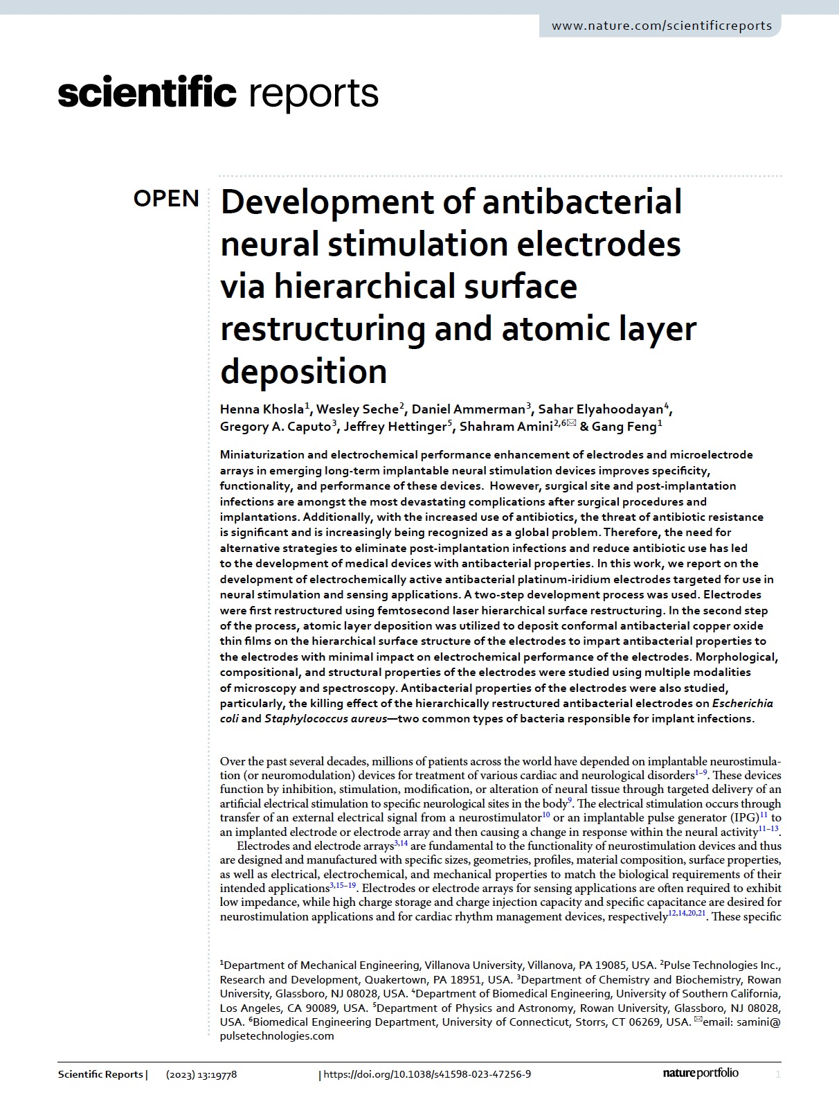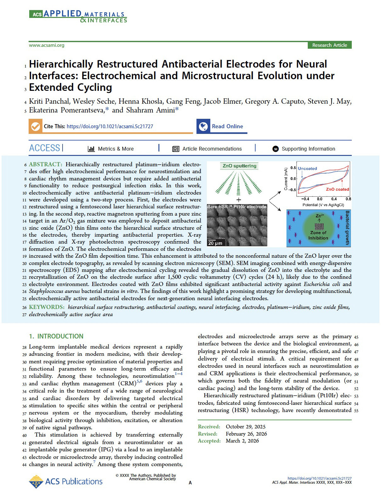 At the same time, the materials commonly used in implantable neural and cardiac electrodes were selected primarily for their electrochemical properties rather than for antimicrobial functionality. Materials such as Pt-10%Ir, and surface coatings such as TiN, and IrO₂ provide excellent performance for sensing, recording, and stimulation, but they do not inherently address infection risk. Conventional antibacterial coatings may offer some protection; however, they can introduce new challenges by masking or altering the high-surface-area electrode architectures that are essential for achieving strong electrochemical performance.